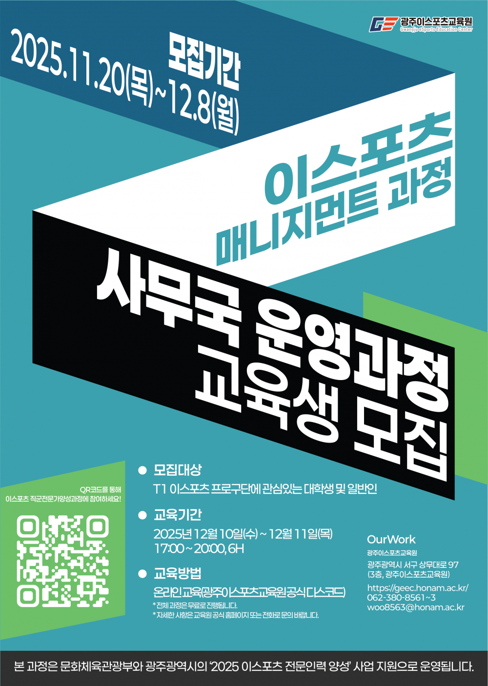 문화체육관광부와 광주광역시의‘2025 이스포츠 전문인력 양성’사업 지원으로 운영되는 광주이스포츠교육원에서 이스포츠산업 활성화와 함께 이스포츠를 이끌어 갈 이스포츠 방송 인재 양성을 위하여 전문 교육과정을 개설하오니 많은 지원 바랍니다.