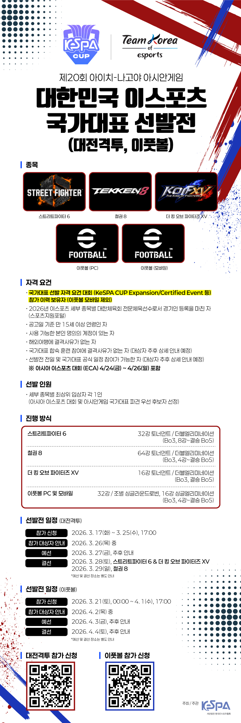 (사)한국e스포츠협회는 2026 아이치-나고야 아시안게임에 참가할 대한민국 이스포츠 국가대표 선발전 (대전격투, 이풋볼)을 아래와 같이 개최하고자 참가자를 모집하고자 하오니 많은 관심과 지원 부탁드립니다.
